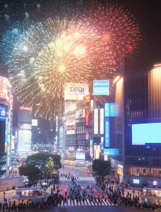 作成した動画は、渋谷の上空で花火が上がっているという、現実では起きえないシチュエーションのものです。Sora 2に指示したプロンプトは以下の通りです。